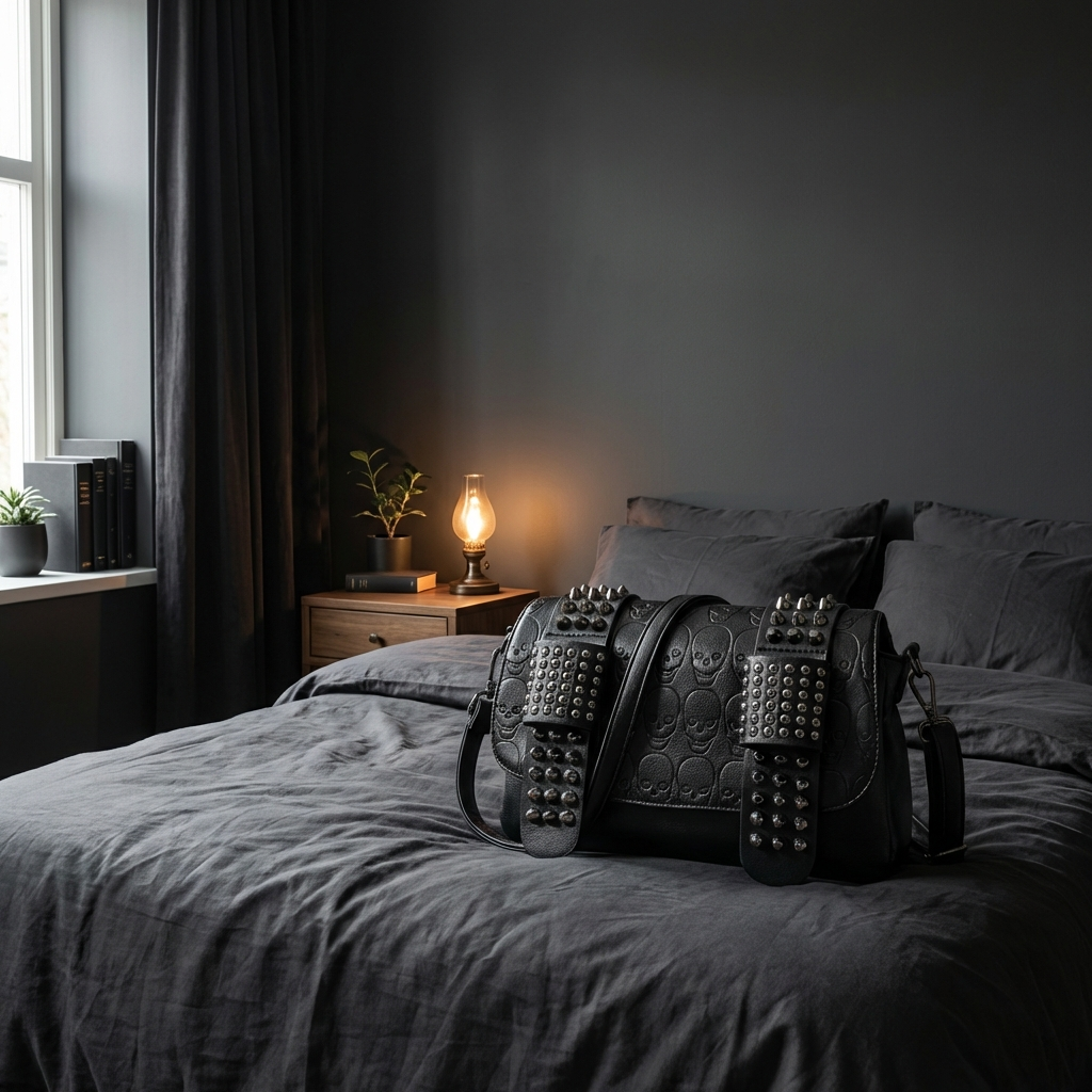 Avec mes sacs à main gothiques, j'ai voulu créer des objets du quotidien qui allient esthétique forte et qualité artisanale. Chaque modèle est confectionné à la main, en petite série, avec des matériaux soigneusement sélectionnés et une attention particulière portée aux détails.